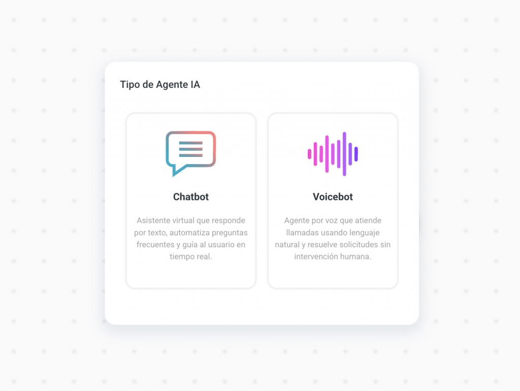 Al momento de crear un agente de IA debemos seleccionar el tipo de agente que queremos crear, si se trata de un agente de texto para canales de chat como WhatsApp, WebChat, Messenger o Instagram o si se trata de un Voicebot para canales de voz como campañas entrantes, IVRs o marcadores.