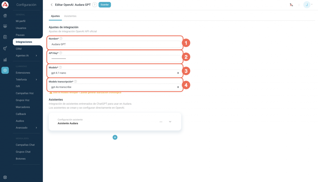 Uno de los LLMs más conocidos es ChatGPT de OpenAI, que se utiliza como motor de respuesta en muchos agentes de IA. Este se integra a la perfección con la plataforma de Audara, de forma simple y rapida.