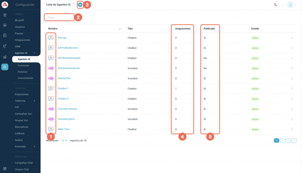 En la imagen superior se puede ver como se compone la vista general del modulo de agentes de IA: