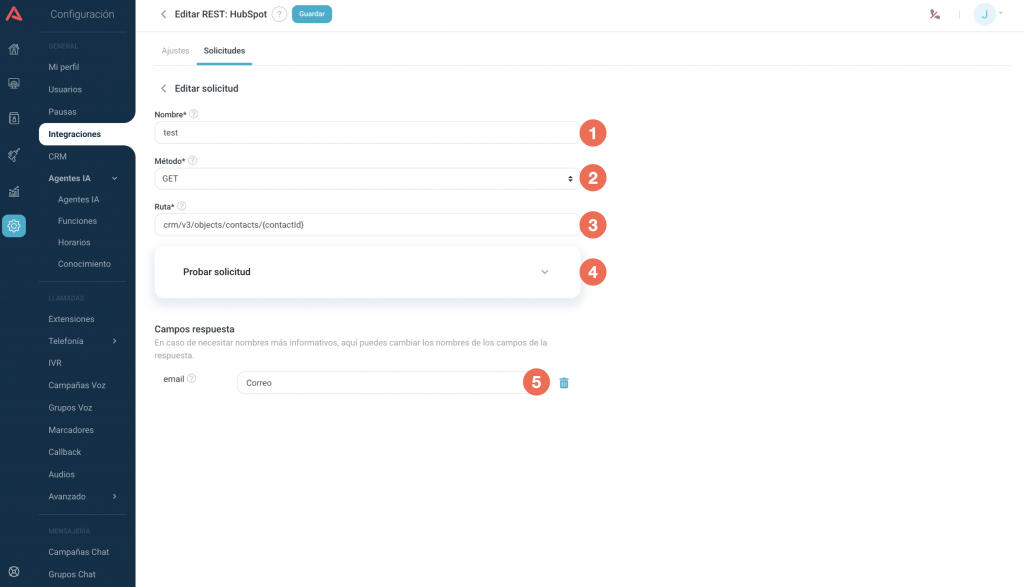 Esta sección permite verificar que tu integración esté funcionando correctamente antes de usarla en un flujo real. Aquí puedes enviar datos de ejemplo y ver cómo responde el sistema externo.