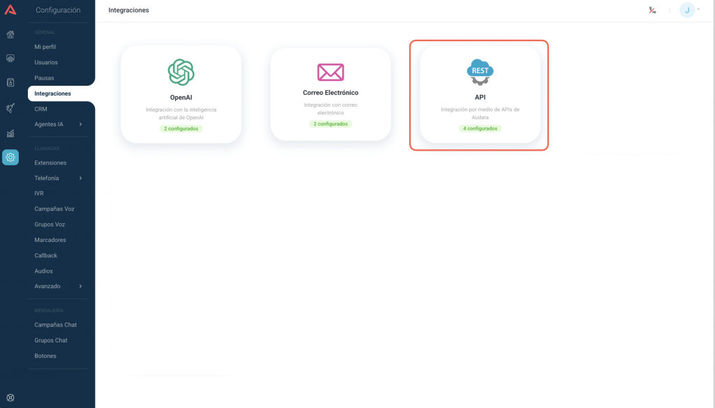 Una vez dentro del módulo de API REST, puedes crear diferentes integraciones según los sistemas externos con los que necesites comunicarte.