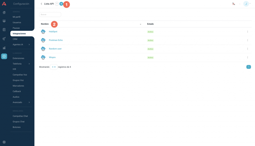 Haz clic en el botón con el ícono de suma (+) para crear una nueva integración API REST. Esto abrirá el formulario donde podrás definir el nombre, URL base y otros ajustes.