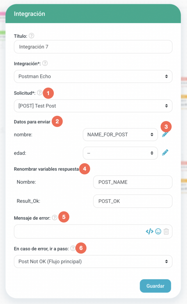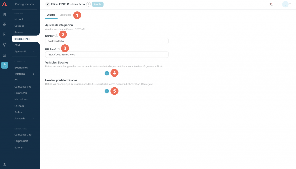 Aquí seleccionas la integración que ya creaste en el módulo de API REST (por ejemplo, “Postman Echo”).