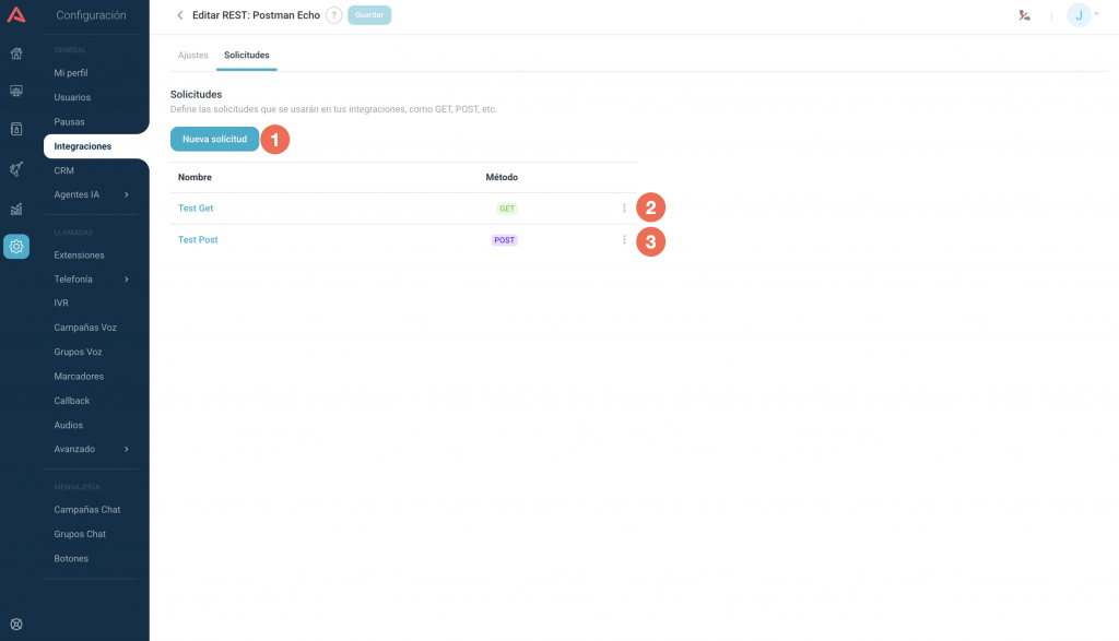 Cada integración puede tener múltiples solicitudes configuradas de manera independiente, ya sea del tipo GET (para consultar datos) o POST (para enviar información). Esto permite estructurar tu conexión de forma modular, ordenada y flexible, manteniendo cada API bien identificada con sus respectivos endpoints y parámetros.
