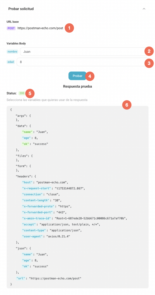 Este sección permite ejecutar la solicitud en tiempo real para verificar que la integración esté funcionando correctamente y visualizar la respuesta. También es clave para seleccionar los datos necesarios que se esperan capturar con la solicitud.