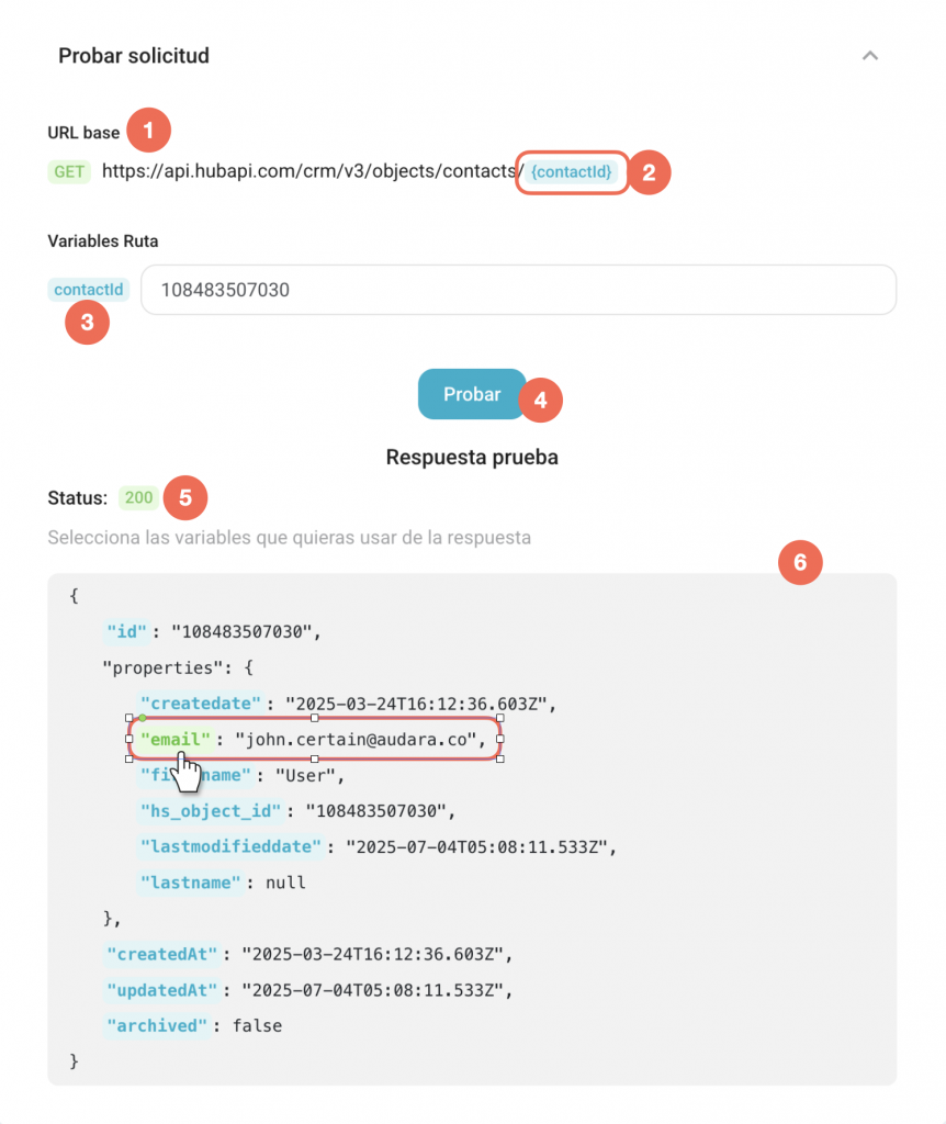 Esto asegura que solo extraes los datos necesarios para tu flujo (por ejemplo: email, firstname, hs_object_id), y no toda la respuesta completa.